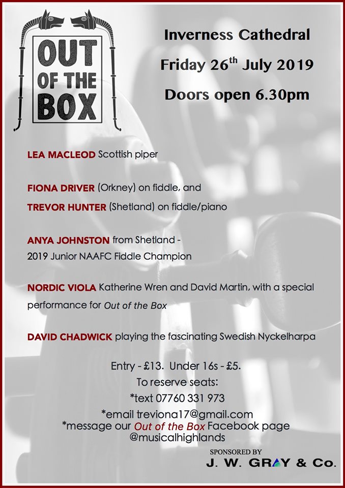 At the end of July, David Martin and I will be performing as part of Fiona Driver’s “Out of the Box” concert in Inverness Cathedral. I first met Fiona and husband Trevor in Orkney last year. Fiona and Trevor are top class fiddle players from the Northern Isles but are also good classical players and enjoy good music of any type. Reflecting their open-minded approach to music of all genres Fiona has assembled a group of interesting musicians currently working in the north. “Out of the Box” will feature traditional music from Fiona and Trevor. Representing the younger generation of Shetland fiddlers will be rising star Anya Johnston. Finally there is David Chadwick playing the Nyckelharpa, a Swedish folk instrument. I’m really looking forward to seeing this unusual instrument at close quarters and you can get a sneak preview here.