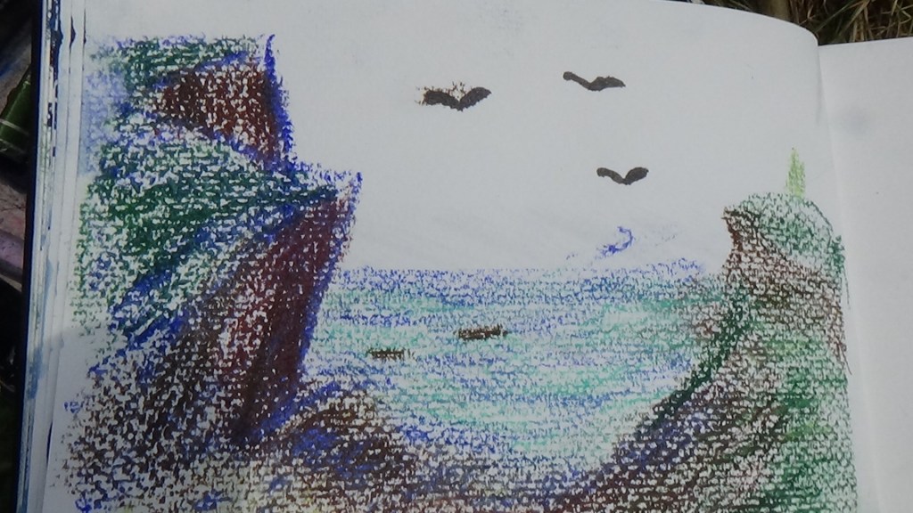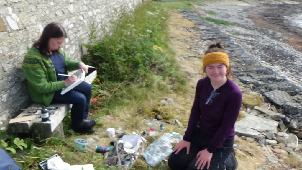 Our filming culminated with interviews in St. Magnus Church, Birsay, generously hosted by Robin Barr and preceded by some much-needed downtime over a packed lunch (and the famous Birsay tea shop pies!) in Robin and Anne’s beautiful garden. During filming, Orla had taken time to sketch down some preliminary ideas and, in her wonderfully natural and enabling way, she encouraged us to express ourselves by drawing down by the beach between interviews – even those like me who haven’t produced any art since secondary school! Orla stayed on in Orkney to consolidate her ideas and you can read some of her initial thoughts here.
