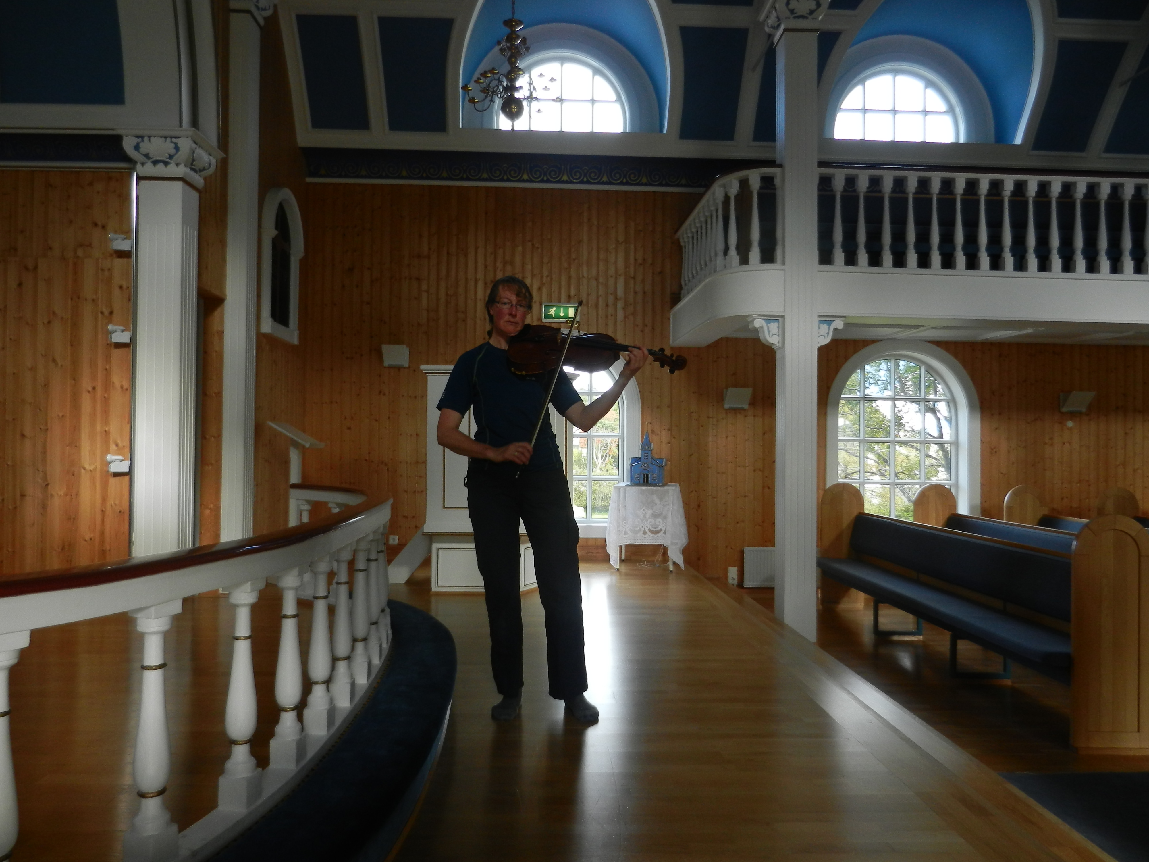 Back in 2016, Seyđisfjörđur in East Iceland was the first stop on my sabbatical. Chosen on the suggestion of friend and Iceland expert, Cathy Harlow because of it’s rich and varied cultural life, (and also for its direct services to the Faroe Islands, which I visited on the same trip) the people in the village welcomed me into their community. I gave short performances in the schools, masterclasses in nearby Egilsstađir and also performed in the magnificent Bláakirkjan (blue church) with local violist, Charles Ross. Bláakirkjan is the most iconic building in Seyđisfjörđur, its colourful blue and white facade standing at the end of the rainbow road. Inside, it is a bright and intimate space, built of wood and gently resonant.