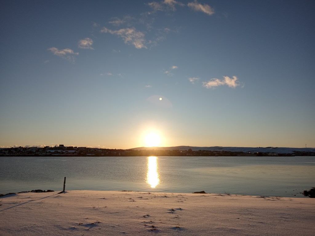 Our performance took place in the Boat Hall at Shetland Museum. I love performing in this space with its views across the harbour and the sixareen next to us as an ever-present reminder of seafaring. The core of our programme was a triptych of pieces by us: Serenity, Bleakness and Windfarm. For those interested in our compositional process, these were partly scored whilst leaving some room for improvisation on the day. The music took us from a state of calm by the sea with birdcalls and the lapping of the water, through a reflection on the bleakness of the open moor, the damage done to the peatland and the impact of bird flu on the skua population. Windfarm speaks for itself with a mixture of industrial sounds, uncomfortable low frequencies and the human voice, followed by an intense processional marking large-scale human footprint on the landscape – and it was scale we were focusing on in this piece and not the principle of renewables, which is something I very much support when done sensitively and with respect.