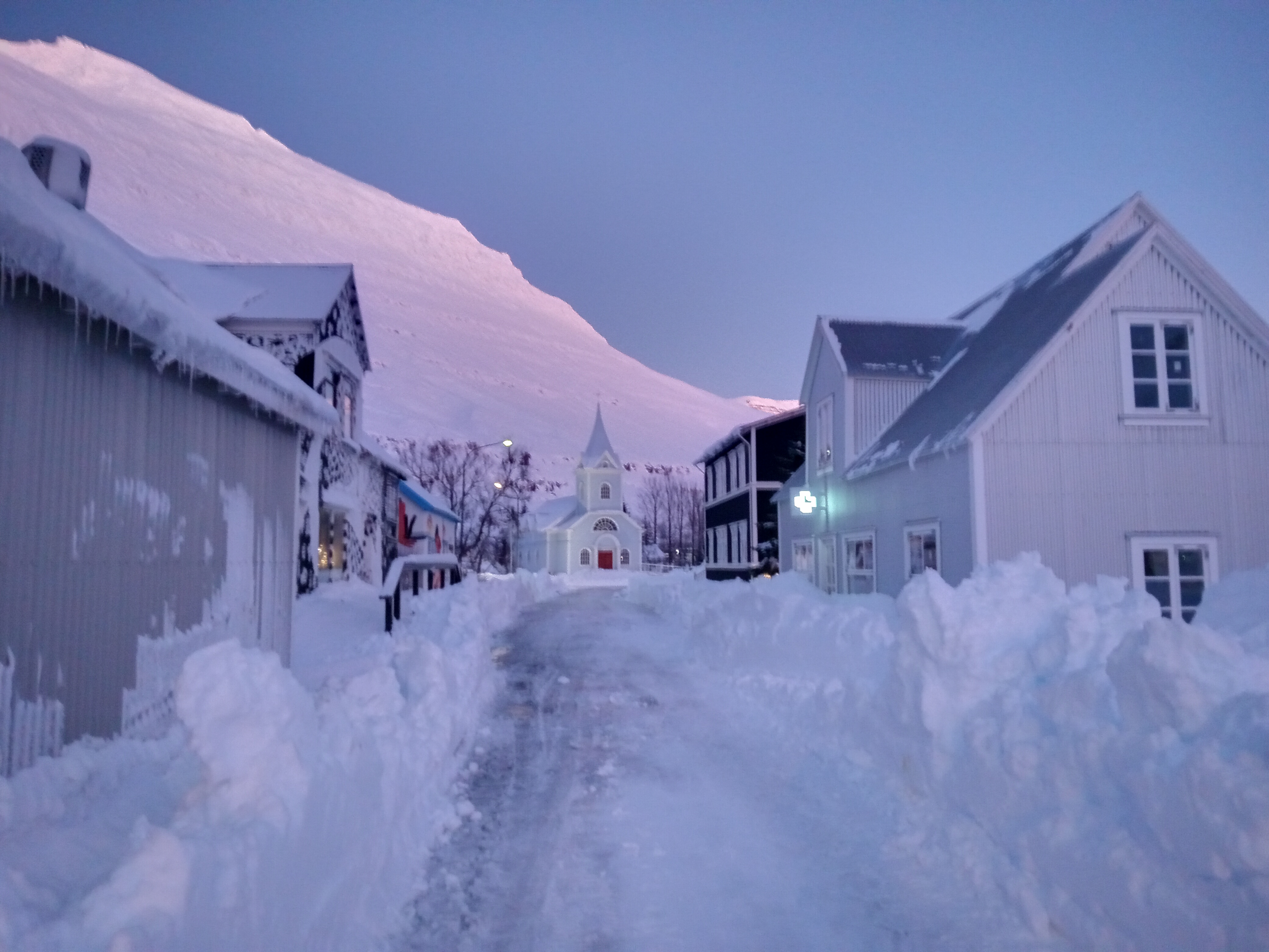 Midweek I was invited by two of the music school staff to join them over in Seyðisfjörður. Seyðisfjörður (population ca. 600) is the first place I went to on sabbatical in 2016. It is in a stunning location at the end of a narrow fjord and I was very eager to see it in winter. Just the day before it had been cut off by snow over the high mountain pass, Fjarðarheiði, and people had been evacuated due to avalanche risk.
