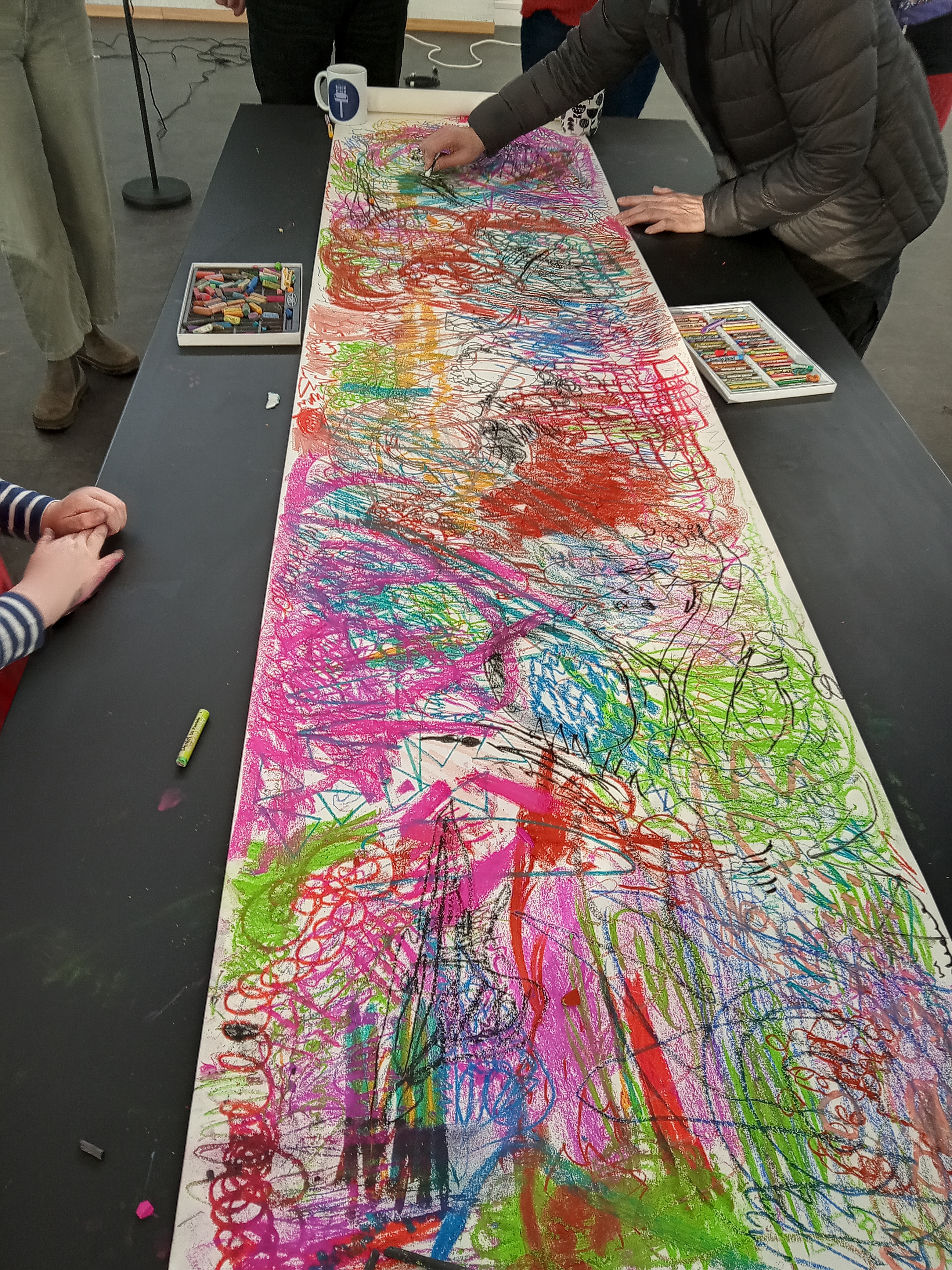 After our initial gathering or ‘foraging’ for sounds, drawings and sound recordings, we headed inside to share our discoveries with each other, and to create some more developed drawings. To reflect the wider soundscape in all its variety and depth, we created very playful, collaborative large-scale drawings: Working as a group to layer our reactions to each sound on top of each other, layer after layer. The end result was a good visual reflection of just how many sounds were out there, once we started tuning in.