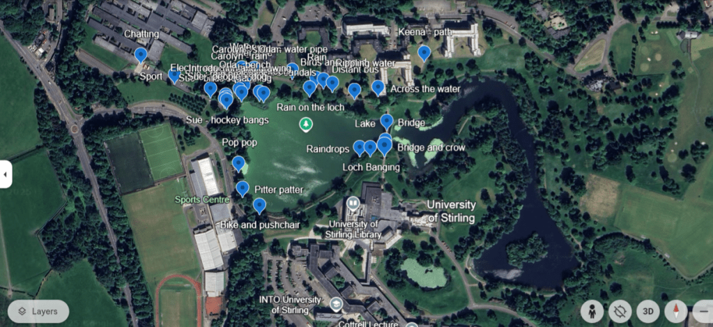 Many thanks to Orla for sharing her thoughts and aims on Drawing to Sound. If you’d like to listen to the sounds that inspired the images above, click on Pete Stollery’s link to our soundmap: bit.ly/artcollectionstirling It’s best viewed using Chrome, Edge, Firefox or Opera browsers and on mobile devices, you’ll be asked to download the Google Earth app to view the map. Click on the pins on the map to hear the sounds in those locations, along with some reflective text from the workshop participants.
