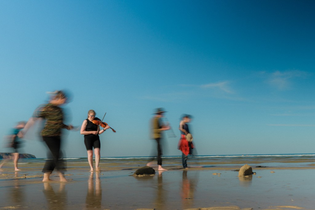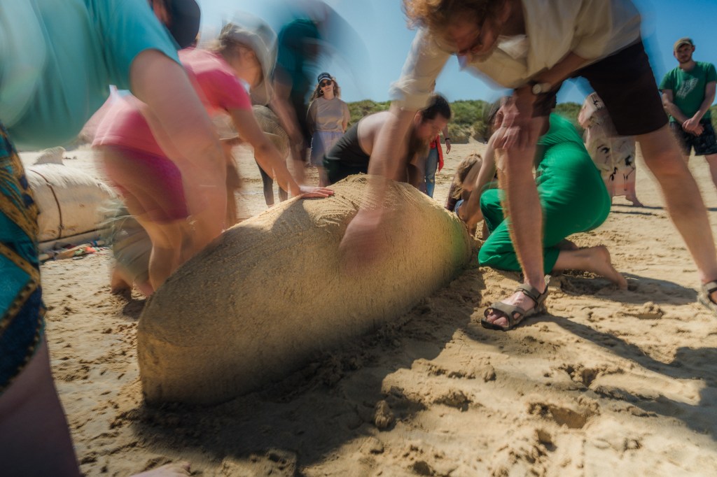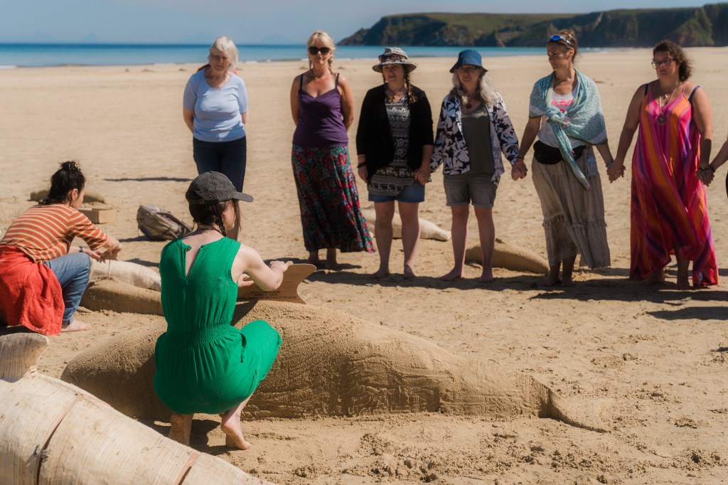 Building the sand whales was a family event with young children in particular loving making the small whales. As each larger whale was built, Sam commemorated them, reading out family links between the whales – simple yet dignified. Alex, Nerea and I then performed a lament for them as members of the community linked hands, remembering the events of 2023. A deeply moving thing to witness.