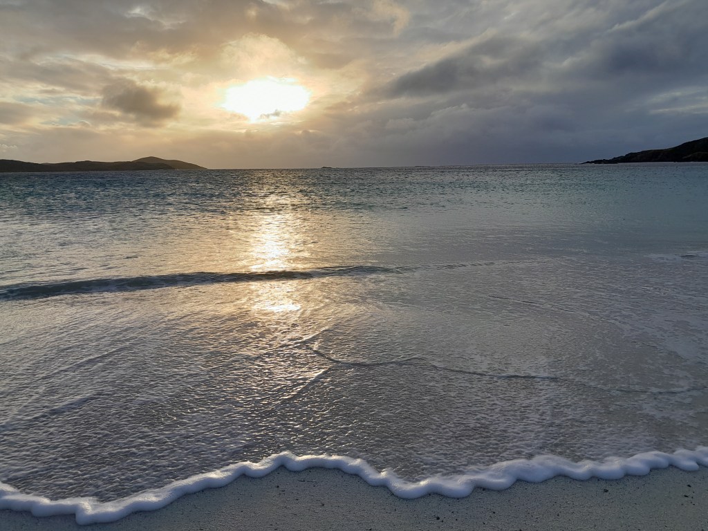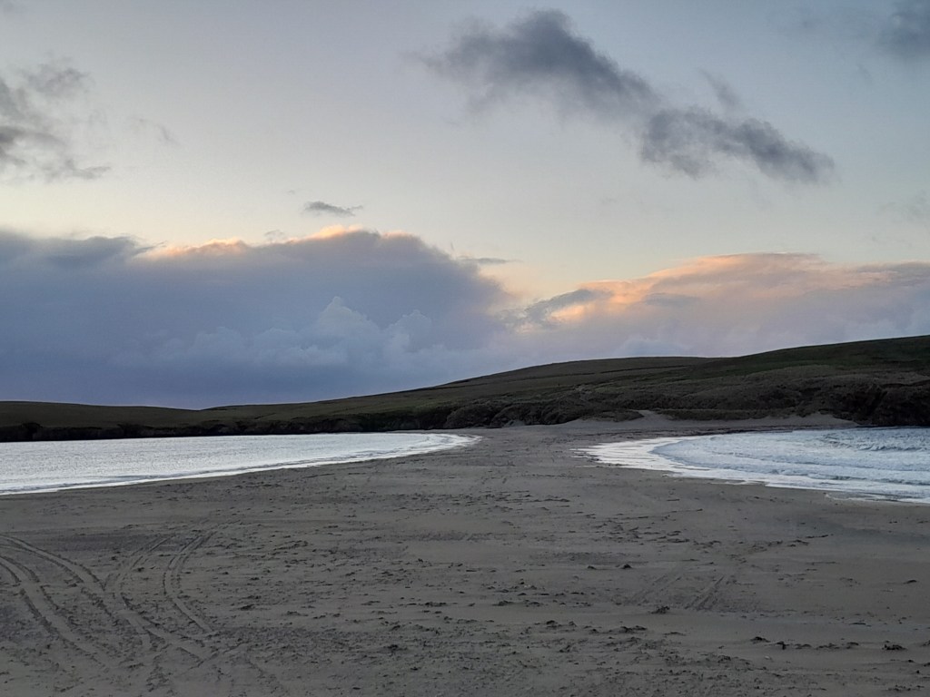 Our day ended with sunset on Uyeasound beach. Peaches, pinks and soft blues and the gentle lapping of waves on the shore, so different from the powerful sound of the deep, churning sea at Hermaness.