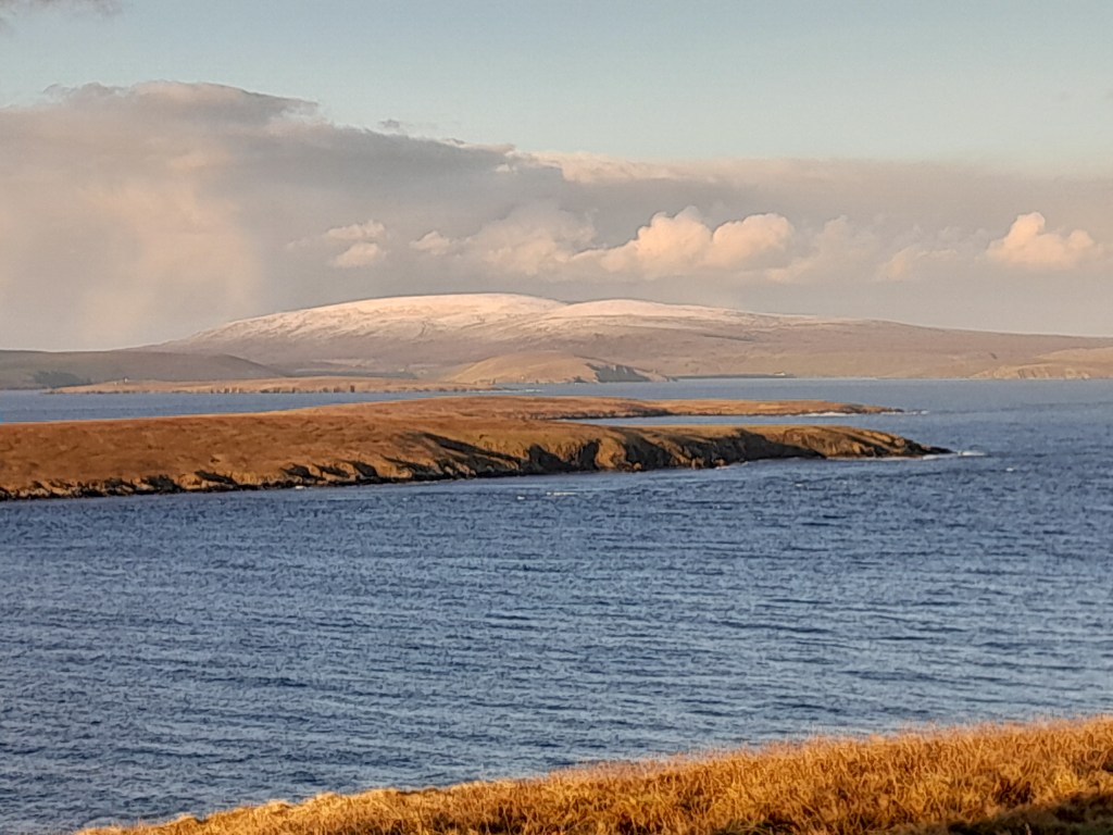 Arriving in Unst was special – so many memories of staying in Baltasound in winter. Unst is such a different landscape: you really know you’ve arrived in the Far North and, just in case we had forgotten, there was a sprinkling of snow on the road. The landscape looks more barren and windswept, almost tundra-like and the light is so low. Every blade of grass is picked out in the sun, the colours are rich and golden with long, long shadows and the sea is a deep blue. But then a passing hail shower can just render the whole landscape in black and white – equally beautiful in its stark simplicity.