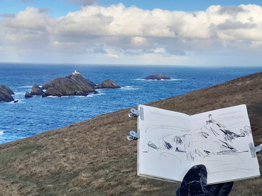 It turned out to be a very special week for me as the light and the weather were almost identical to my time there on sabbatical. It really felt like winding the clock back, especially as I found myself seeing the landscapes afresh as Orla experienced them for the first time. A particular highlight was spending the day in Unst and walking out to Hermaness and Muckle Flugga. We drove through the morning twilight up to the North Isle ferries and sunrise didn’t occur until we arrived in Yell. And what a spectacle it was: the fresh snow on Ronas Hill lit up in pastel pinks by the dawn light, deep blue sea and the russet reds of the moorlands. So beautiful that we pulled in to sketch for a while – one of us rather more professionally than the other, yet what I love about being around Orla is that there is no judgement, just a desire to enable everyone to observe and draw what moves them.